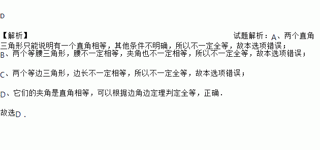D 【解析】试题解析:A、两个直角三角形只能说明有一个直角相等,其他条件不明确,所以不一定全等,故本选项错误; B、两个等腰三角形,腰不一定相等,夹角也不一定相等,所以不一定全等,故本选项错误; C、两个等边三角形,边长不一定相等,所以不一定全等,故本选项错误; D、它们的夹角是直角相等,可以根据边角边定理判定全等,正确. 故选D.