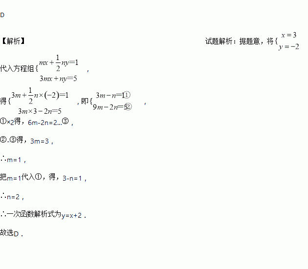 如果是方程组的解,则一次函数y=mx+n的解析式为( )