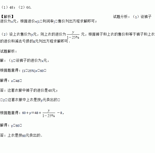 (1)48;(2)60. 【解析】试题分析:(1)设裤子进价为x元,根据进价×(1+利润率)=售价列出方程求解即可; (2)设上衣售价为y元,则上衣的进价为元,根据裤子和上衣的售价和等于裤子和上衣的进价和减去亏损的8元列出方程求解即可. 试题解析: 【解析】 (1)设裤子的进价为x元, 根据题意得:(1+25%)x=60, 解得:x=48. 答:这套衣服...