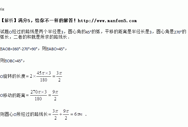 已知一个圆心角为270°扇形工件,未搬动前如图所示,A、B两点触地放置,搬动时,先将扇形以B为圆心,作如图所示的无滑动翻转,再使它紧贴地面滚动,当A、B两点再次触地时停止,若半圆的半径为3m,则圆心O所经过的路线长是_____m. (结果保留π)