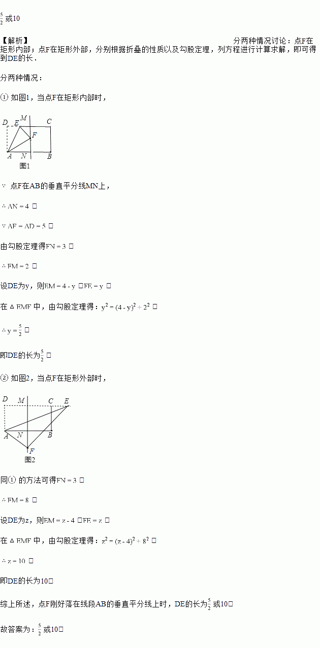 如图,在矩形ABCD中,,,点E为射线DC上一个动点,把沿直线AE折叠,当点D的对应点F刚好落在线段AB的垂直平分线上时,则DE的长为______.