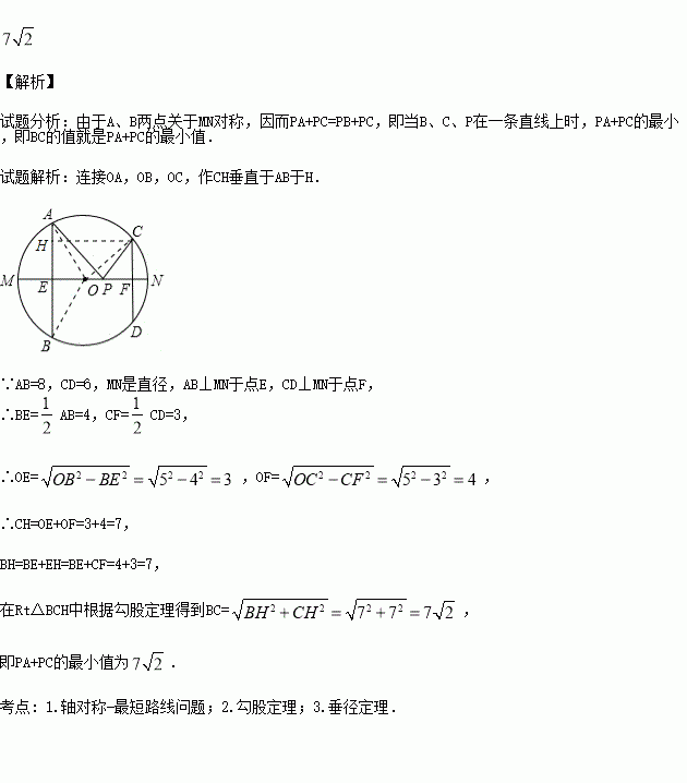 如图,AB、CD是半径为5的⊙O的两条弦,AB=8,CD=6,MN是直径,AB⊥MN于点E,CD⊥MN于点F,P为EF上的任意一点,则PA+PC的最小值为多少?
