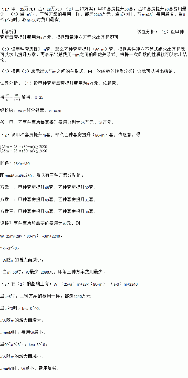(3)在(2)的条件下,根据市场调查,每套乙种套房的提升费用不会改变,每套甲种套房提升费用将会提高a万元(a>0),市政府如何确定方案才能使费用最少?