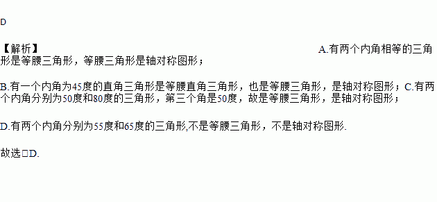 C. 有两个内角分别为50°和80°的三角形 D. 有两个内角分别为55°和65°的三角形