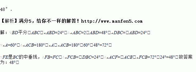 如图,在△ABC中,BD平分∠ABC,BC的垂直平分线交BC于点E,交BD于点F,连接CF.若∠A=60°,∠ABD=24°,则∠ACF=___________.