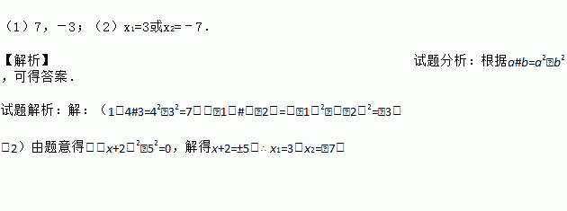 (1)7,-3;(2)x1=3或x2=﹣7. 【解析】试题分析:根据a#b=a2﹣b2,可得答案. 试题解析:【解析】 (1)4#3=42﹣32=7,(﹣1)#(﹣2)=(﹣1)2﹣(﹣2)2=﹣3; (2)由题意得:(x+2)2﹣52=0,解得x+2=±5,∴ x1=3,x2=﹣7.