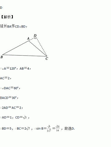 如图,在△ABC中,∠A=120°,AB=4,AC=2,则sinB的值是( )