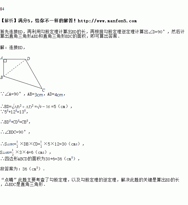 已知,如图,四边形ABCD中,AB=3cm,AD=4cm,BC=13cm,CD=12cm,且∠A=90°,求四边形ABCD的面积.