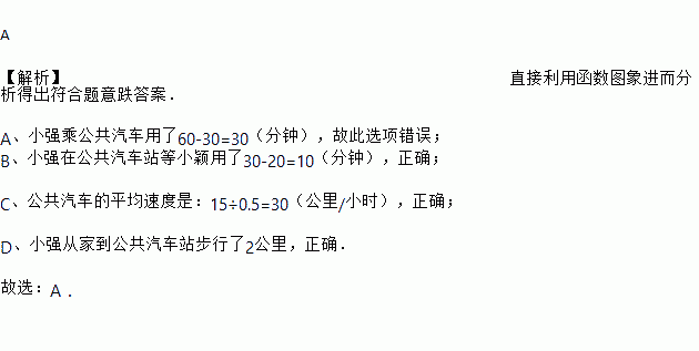 C. 公共汽车的平均速度是30公里/小时 D. 小强从家到公共汽车站步行了2公里