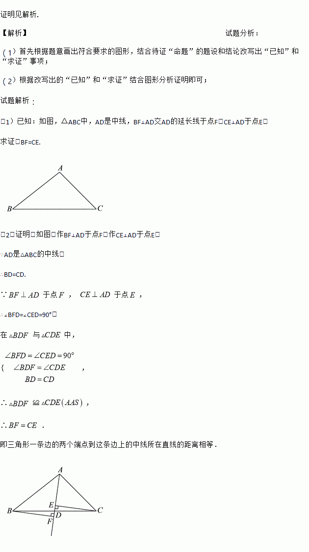 求证:三角形一条边的两个端点到这条边上的中线所在的直线的距离相等.