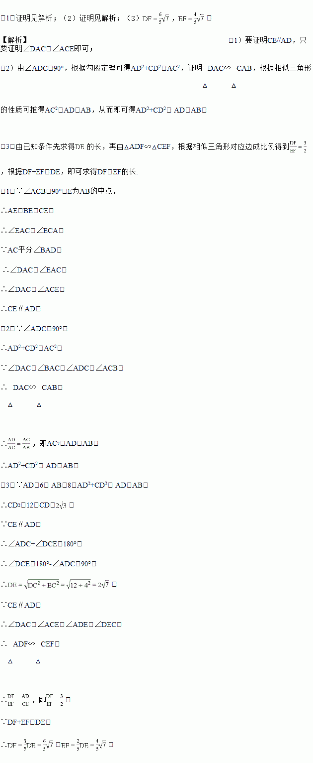 如图,在四边形ABCD中,AC平分∠BAD,∠ADC=∠ACB=90°,E为AB的中点,AC与DE交于点F.