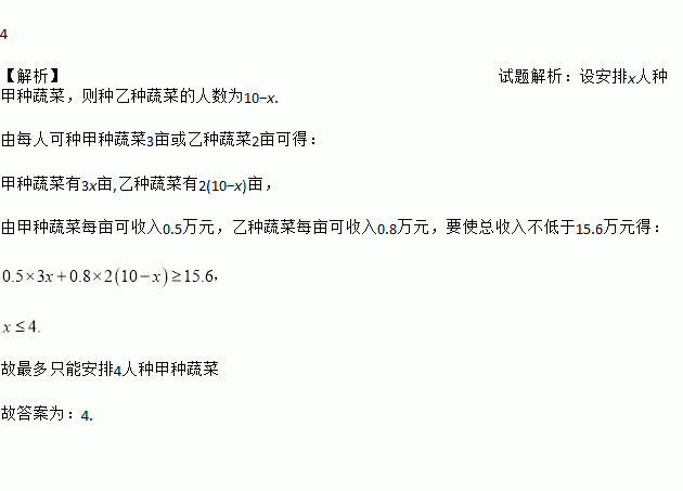 有10名菜农,每人可种甲种蔬菜3亩乙种蔬菜2亩,已知甲种蔬菜每亩可收入0.5万元,乙种蔬菜每亩可收入0.8万元,若要使收入不低于15.6万元,则最多只能安排_________人种甲种蔬菜.