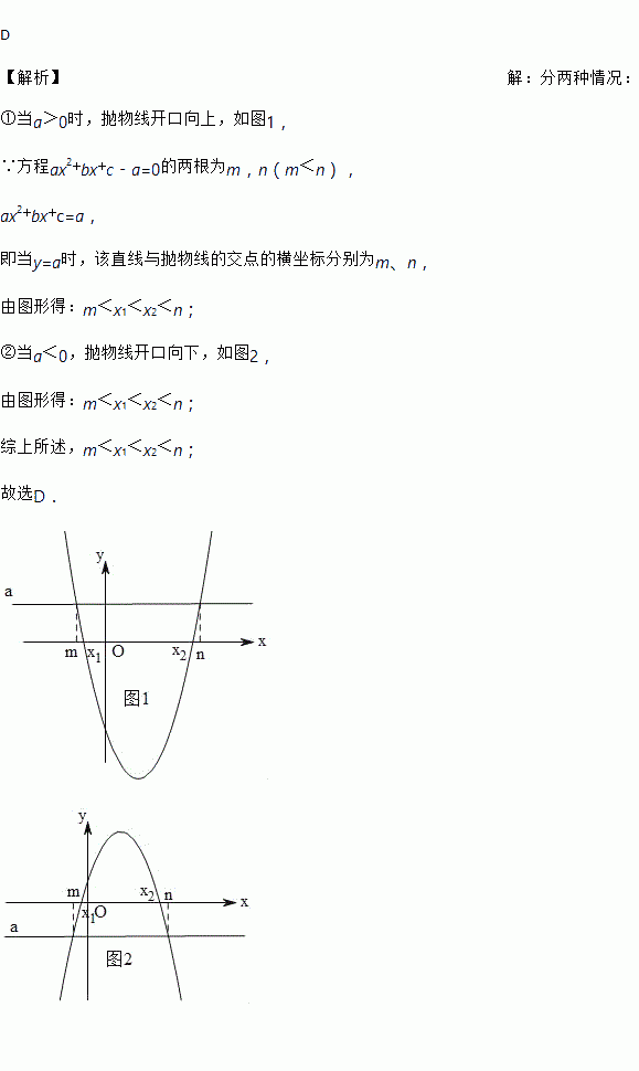 D 【解析】【解析】 分两种情况: ①当a>0时,抛物线开口向上,如图1, ∵方程ax2+bx+c﹣a=0的两根为m,n(m<n), ax2+bx+c=a, 即当y=a时,该直线与抛物线的交点的横坐标分别为m、n, 由图形得:m<x1<x2<n; ②当a<0,抛物线开口向下,如图2, 由图形得:m<x1<x2<n; 综上所述,m<x1<x2<...