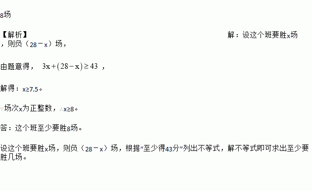 某校班际篮球联赛中,每场比赛都有胜负,每队胜1场得3分,负1场得1分,如果某班要在第一轮的28场比赛中至少得43分,那么这个班至少要胜多少场?