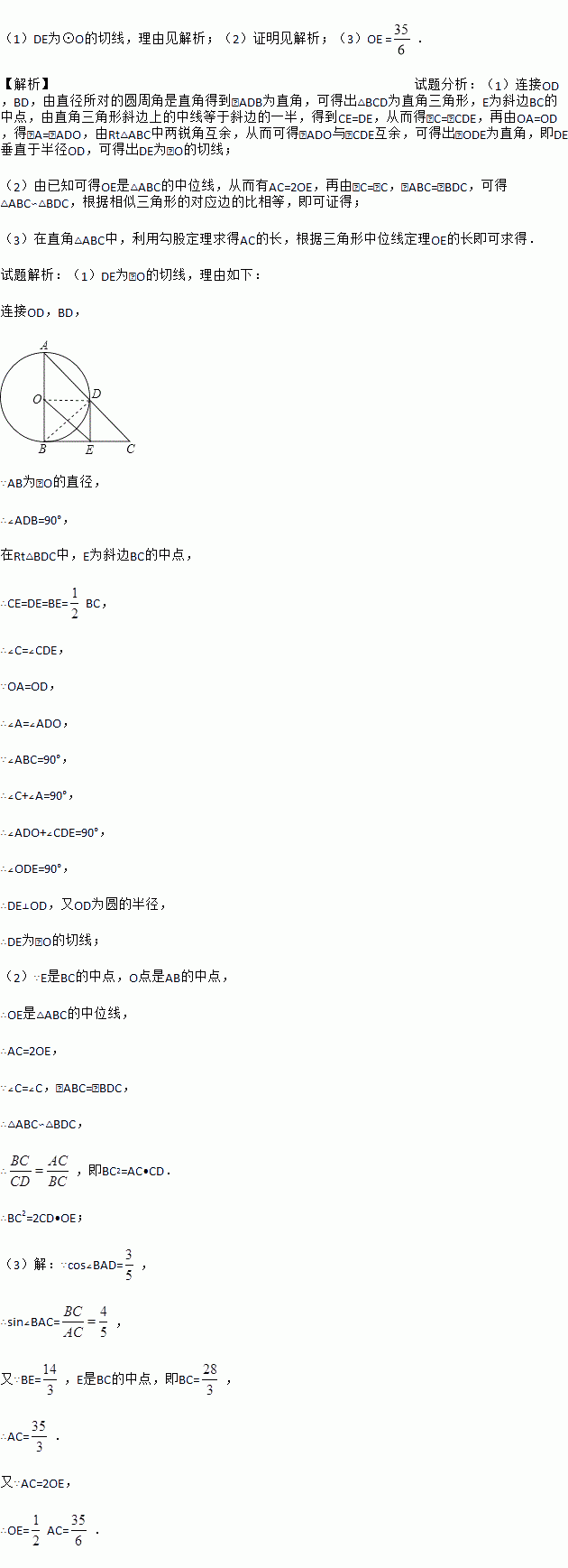 如图,在△ABC中,∠ABC=90°,以AB的中点O为圆心,OA为半径的圆交AC于点D,E是BC的中点,连接DE,OE.