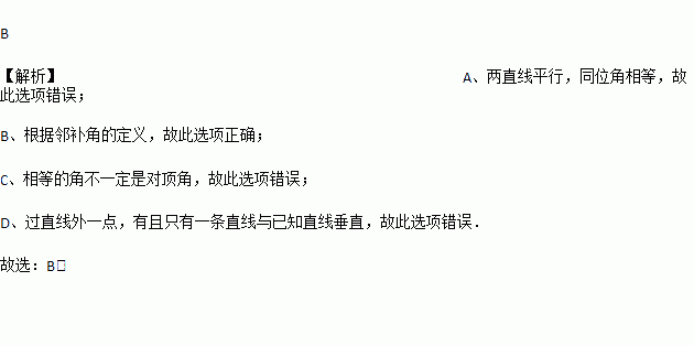C. 相等的角是对顶角 D. 有且只有一条直线与已知直线垂直