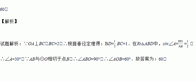 如图,AB与⊙O相切于点B,线段OA与弦BC垂直,垂足为D,AB=BC=2,则∠AOB=______°.