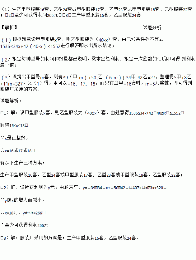 下岗职工王阿姨利用自己的﹣技之长开办了“爱心服装厂”,计划生产甲、乙两种型号的服装共40套投放到市场销售.已知甲型服装每套成本34元,售价39元;乙型服装每套成本42元,售价50元.服装厂预计两种服装的成本不低于1536元,不高于1552元.