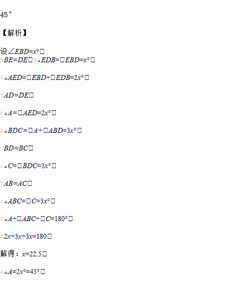 如图:在△ABC中,AB=AC,BC=BD,AD=DE=EB,则∠A=________.