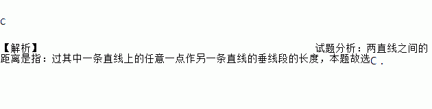 C 【解析】试题分析:两直线之间的距离是指:过其中一条直线上的任意一点作另一条直线的垂线段的长度,本题故选C.