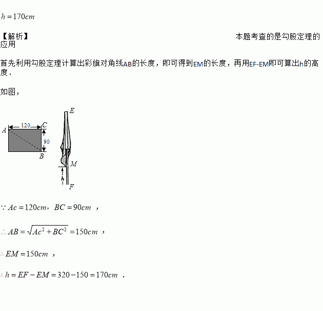 将穿好彩旗的旗杆垂直插在操场上,旗杆从旗顶到地面的高度为320cm, 在无风的天气里,彩旗自然下垂,如右图. 求彩旗下垂时最低处离地面的最小高度h.彩旗完全展平时的尺寸如左图的长方形(单位:cm).