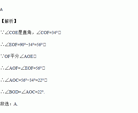如图,已知直线AB和CD相交于O点,∠COE是直角,OF平分∠AOE,∠COF=34°,则∠BOD的大小为( )