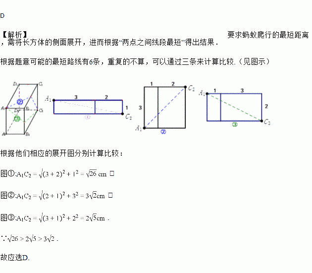 如图,长方形的高为,底面长为 ,宽为,蚂蚁沿长方体表面,从点到(点 见图中黑圆点)的最短距离是( )