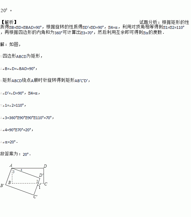 如图,将矩形ABCD绕点A顺时针旋转到矩形AB′C′D′的位置,旋转角为α(0°<α<90°),若∠1=110°,则∠α= .