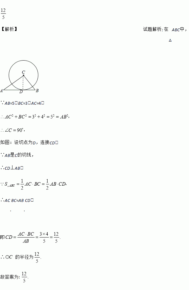 如图,在△ABC中,AB=5,BC=3,AC=4,以点C为圆心的圆与AB相切,则⊙C的半径为____________.