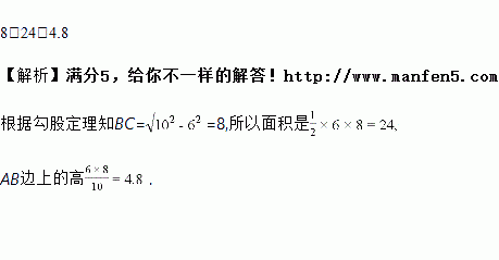在△ABC中,∠C=90°,AB=10,AC=6,则另一边BC=________,面积为________,AB边上的高为________.