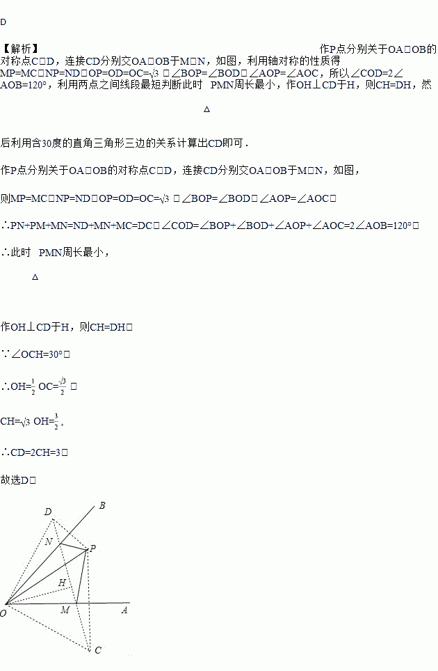 如图,∠AOB=60°,点P是∠AOB内的定点且OP=,若点M、N分别是射线OA、OB上异于点O的动点,则△PMN周长的最小值是( )