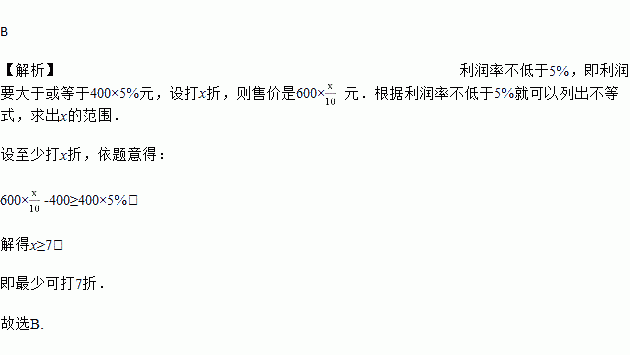 某种商品的进价为400元,出售时标价为600元,后来由于该商品积压,商店准备打折销售,但在保证利润率不低于5%,则至少可打( )