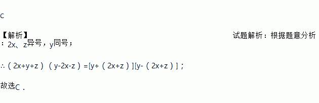 C 【解析】试题解析:根据题意分析:2x、z异号,y同号; ∴(2x+y+z)(y-2x-z)=[y+(2x+z)][y-(2x+z)]; 故选C.