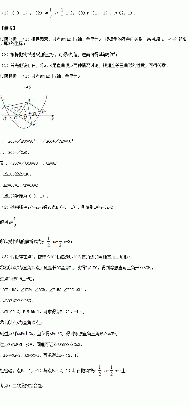 (3)在抛物线上是否还存在点P(点B除外),使△ACP仍然是以AC为直角边的等腰直角三角形?若存在,求所有点P的坐标;若不存在,请说明理由。