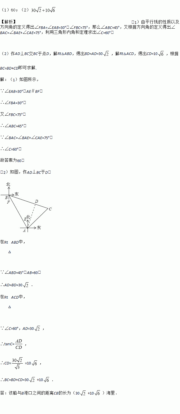 某海域有A、B两个港口,B港口在A港口北偏西30°方向上,距A港口60海里,有一艘船从A港口出发,沿东北方向行驶一段距离后,到达位于B港口南偏东75°方向的C处,求: