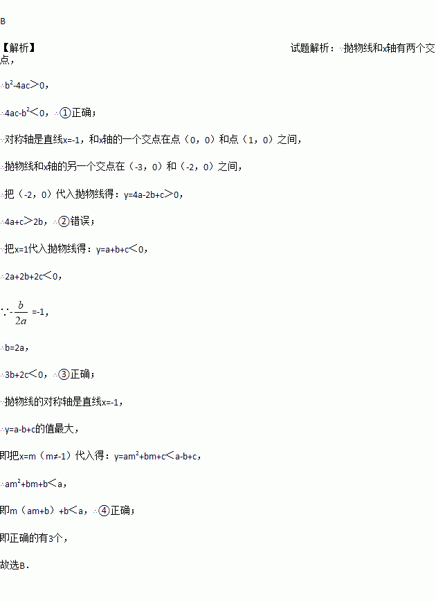 二次函数y=ax2+bx+c(a≠0)的图象如图,给出下列四个结论:①4ac﹣b2<0;②4a+c<2b;③3b+2c<0;④m(am+b)+b<a(m≠﹣1),其中正确结论的个数是( )