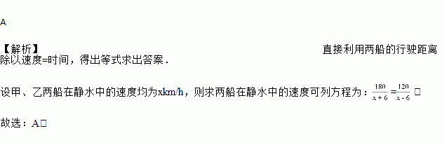 甲、乙两船从相距300km的A、B两地同时出发相向而行,甲船从A地顺流航行180km时与从B地逆流航行的乙船相遇,水流的速度为6km/h,若甲、乙两船在静水中的速度均为xkm/h,则求两船在静水中的速度可列方程为( )