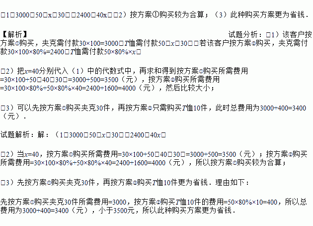 迪雅服装厂生产一种夹克和T恤,夹克每件定价100元,T恤每件定价50元.厂方在开展促销活动期间,向客户提供两种优惠方案:①买一件夹克送一件T恤;②夹克和T恤都按定价的80%付款.现某客户要到该服装厂购买夹克30件,T恤x件(x>30).
