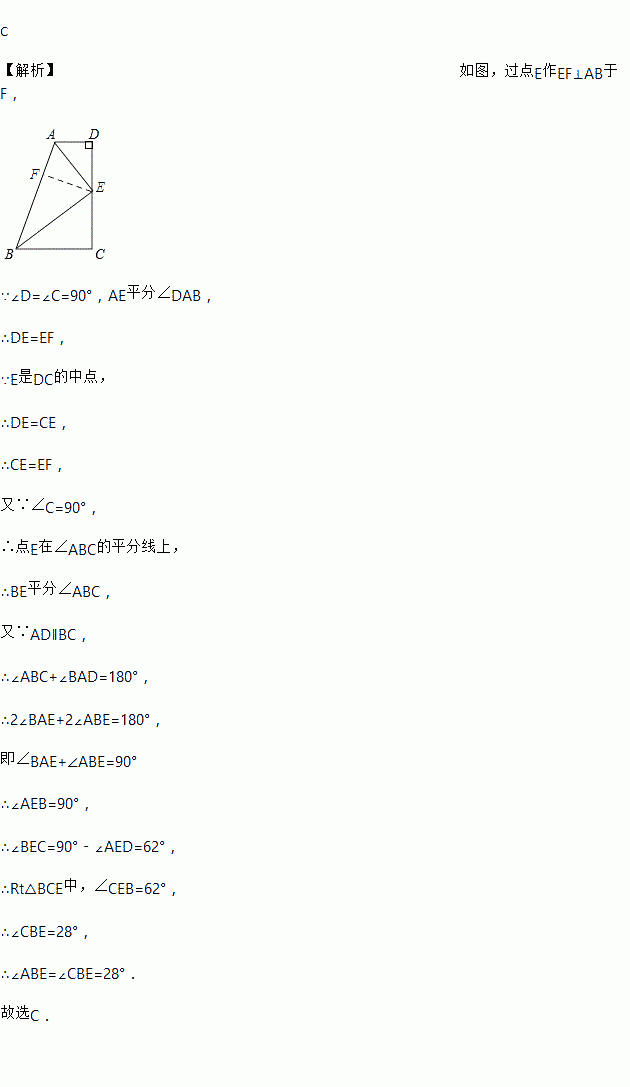 如图,∠D=∠C=90°,E是DC的中点,AE平分∠DAB,∠DEA=28°,则∠ABE的度数是( )
