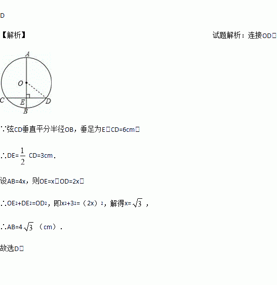 如图,AB为⊙O的直径,弦CD垂直平分半径OB,垂足为E,CD=6cm,则直径AB的长是( )