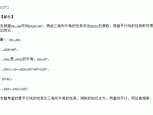 如图DE⊥AB,EF∥AC,∠A=35°,求∠DEF的度数.