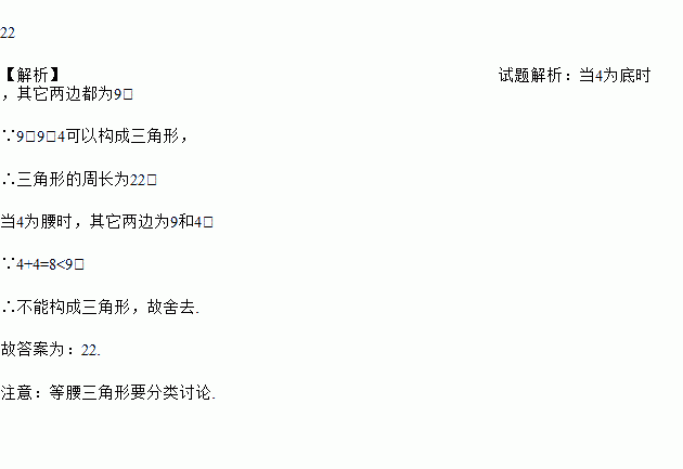 22 【解析】试题解析:当4为底时,其它两边都为9, ∵9、9、4可以构成三角形, ∴三角形的周长为22; 当4为腰时,其它两边为9和4, ∵4+4=8<9, ∴不能构成三角形,故舍去. 故答案为:22. 注意:等腰三角形要分类讨论.