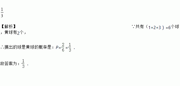 在一个不透明的袋子中装有1个白球,2个黄球和3个红球,每个除颜色外完全相同,将球摇匀从中任取一球,恰好取出黄球的概率是 .