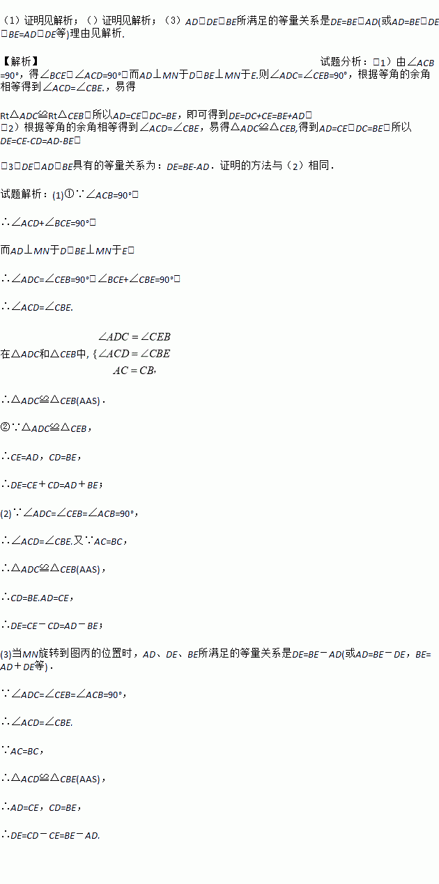 (3)µ±Ö±ÏßMNÈÆµãCÐýתµ½Í¼±ûµÄλÖÃʱ£¬ÊÔÎÊDE¡¢AD¡¢BE¾ßÓÐÔõÑùµÄµÈÁ¿¹ØÏµ£¿Çëд³öÕâ¸öµÈÁ¿¹ØÏµ£¬²¢¼ÓÒÔÖ¤Ã÷£®