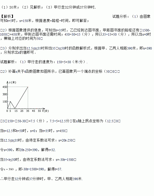 甲、乙两人匀速从同一地点到1500米处的图书馆看书,甲出发5分钟后,乙以50米/分的速度沿同一路线行走. 设甲、乙两人相距(米),甲行走的时间为![]()