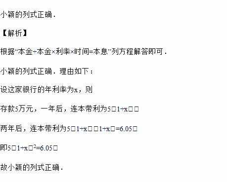 某人在一家银行存款万元,两年后连本带利共得万元,问这家银行的年利率为多少?小明是这样列式的:;小颖是这样列式的:.你认为谁的想法是正确的?为什么?
