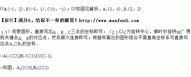 (2)将△ABC绕着点C顺时针方向旋转90°后得到△A1B2C,画出旋转后的△A1B1C,并写出A1,B1的坐标.