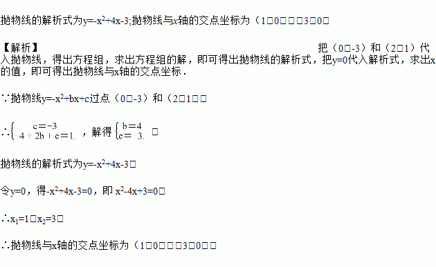 抛物线y=-x2+bx+c过点(0,-3)和(2,1),试确定抛物线的解析式,并求出抛物线与x轴的交点坐标.