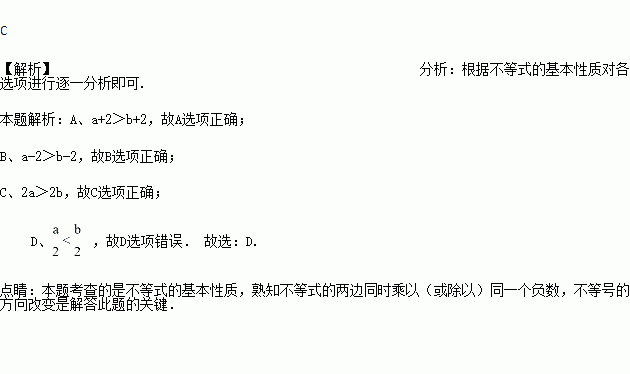 A. a+2>b+2 B. a-2>b-2 C. -2a>-2b D. >