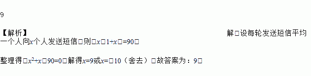 某人用手机发短信,获得信息人也按他的发送人数发送该条短信,经过两轮短信的发送,共有90人手机上获得同一条信息,则每轮发送短信中,平均一个人向_____ 个人发送短信.